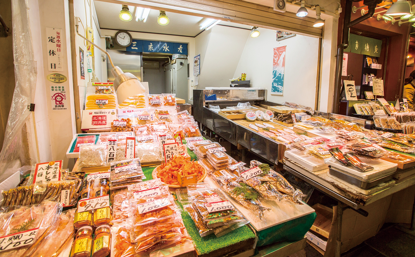 カラスミやエイヒレなど国産珍味が魅力の干物店。馴染みの魚介をわさびや一味で味付けをするなど、食材の新たな一面を引き出してくれる。