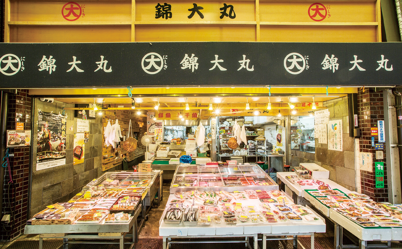 豊富な魚介類が揃い店頭のテーブルで刺身なども気軽に味わえる。また奥には、店で扱う新鮮素材を使う料理店「錦大丸 よし」も。